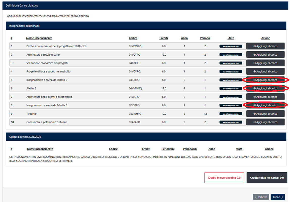 The allocation of elective course from Table 5 will be based on merit criteria, on the order of preference expressed and on the Scientific Disciplinary Fields present in the assigned Atelier 3.
