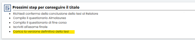 All'interno del portlet "Prossimi step per conseguire il titolo", è disponibile la funzione "Carica la versione definitiva della tesi", da utilizzare per completare l’operazione.